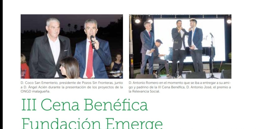 Este evento de carácter solidario permitió a la Fundación Emerge apoyar la labor de la ONGD Pozos Sin Fronteras el pasado 28 de junio. Cuyo objetivo social es crear oportunidades de desarrollo a través de la gestión del agua en comunidades africanas y sudamericanas.